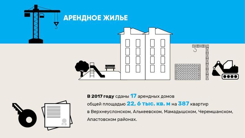 С начала года в Татарстане построили 63 арендных дома в Алькеевском, Апастовском, Верхнеуслонском, Сабинском и Мензелинском районах. Общая площадь составляет 6,8 тысячи квадратных метров. До конца года будут сданы еще 119 домов на 21 тыс. кв. м. В этом году в республике сдадут в эксплуатацию 182 жилых дома на 545 квартир площадью 28,7 тыс. кв. м. Из них — 3 дома на 365 квартир по второй очереди арендного жилья в Иннополисе.