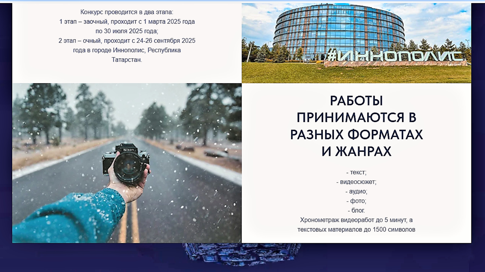 Конкурсантам предлагается представить свои работы в 15 номинациях, охватывающих самые разные форматы – от видеороликов и подкастов до фоторепортажей и социальных проектов. В других номинациях можно предлагать образовательный контент, короткие креативные видео и материалы об экологических инициативах.