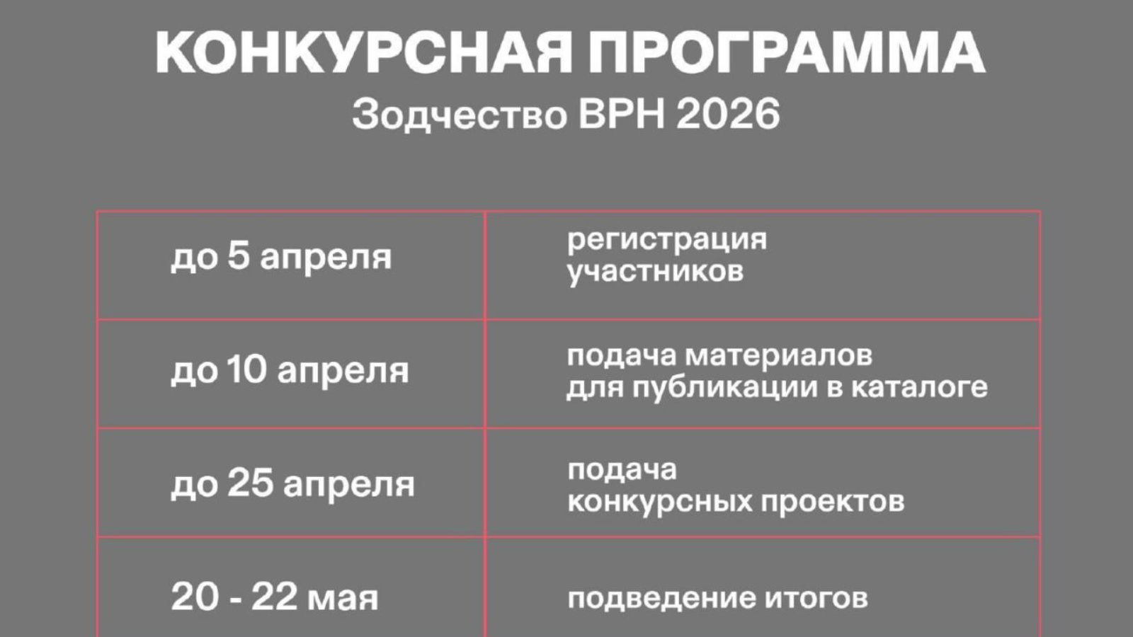 В рамках форума проходит конкурсная программа. Ее цель - выявление авторов, чьи проекты были успешно реализованы, и проектных предложений, демонстрирующих успешные примеры архитектурно-градостроительной политики и проектирования застройки или реконструкции объектов капитального строительства всех городов России и ближнего зарубежья. Конкурсная программа архитектурного форума «Зодчество ВРН 2026» включает проведение смотров-конкурсов «Творчество студентов архитектурных вузов и колледжей», «Проекты» и «Постройки».