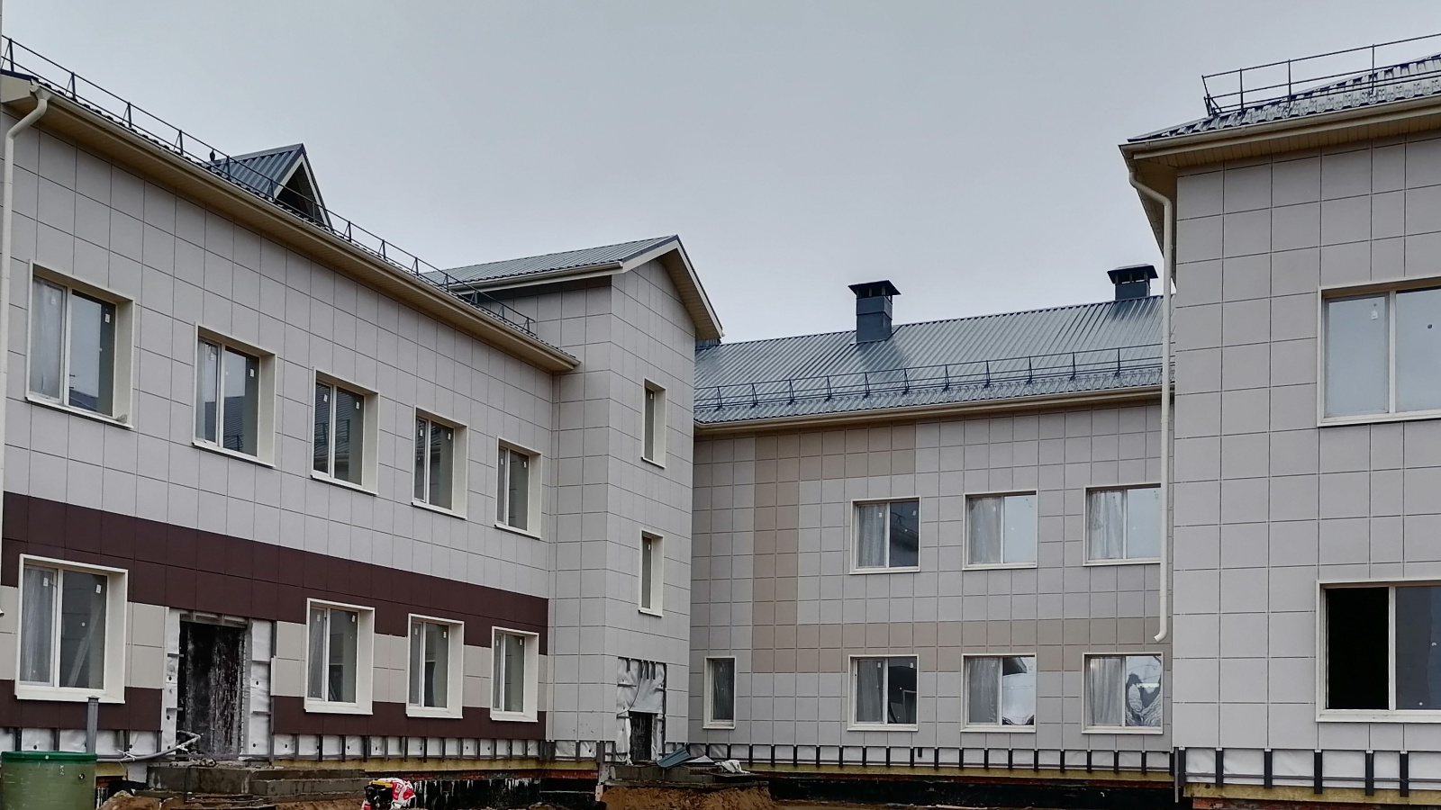 Строители выполняют утепление и облицовку керамогранитом фасада здания, вертикальную планировку, устройство чердака. Также здесь монтируют системы отопления, вентиляции и кондиционирования. Готовность объекта превышает 50%.